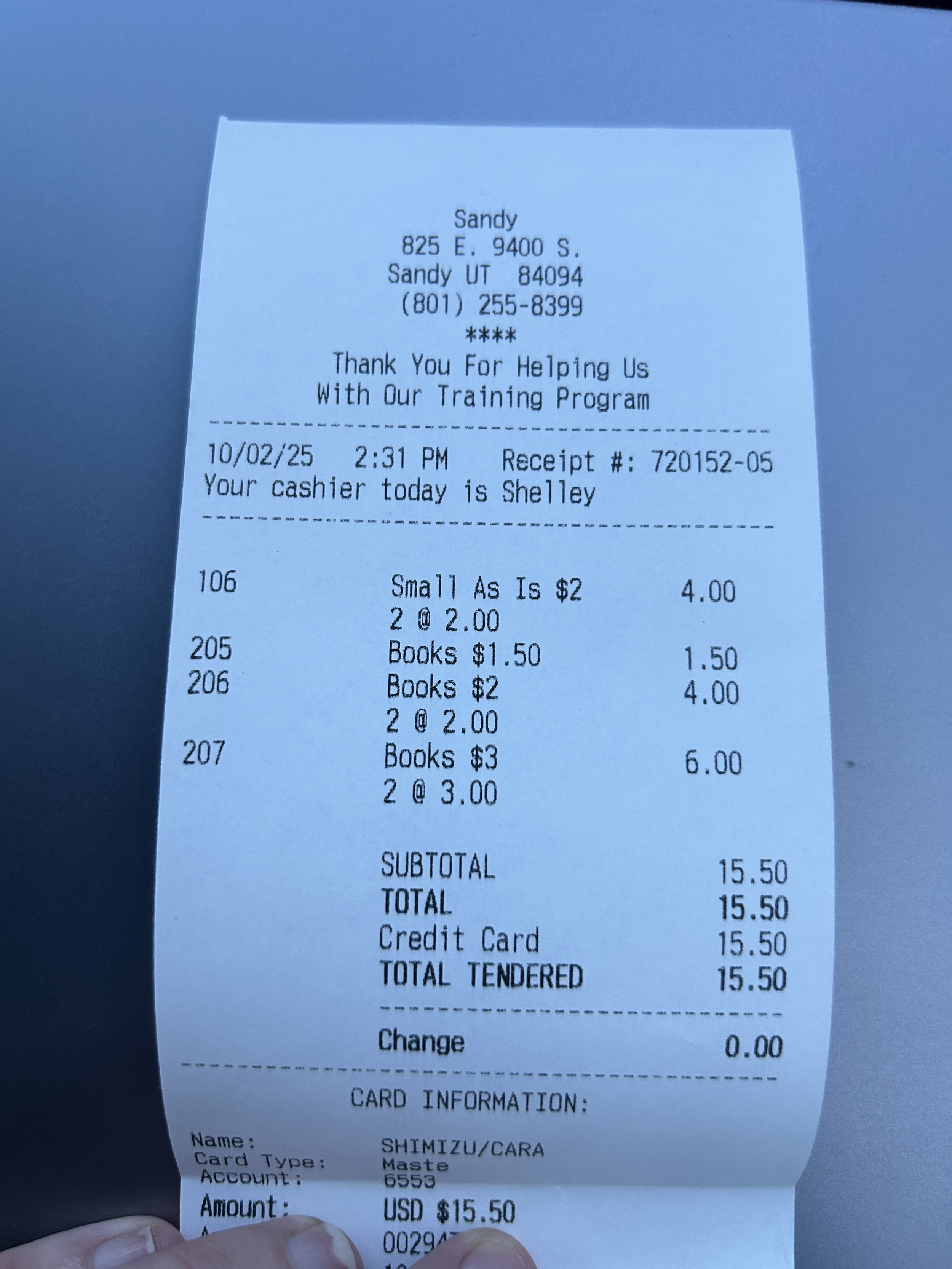 Items purchased are listed with photos of receipts