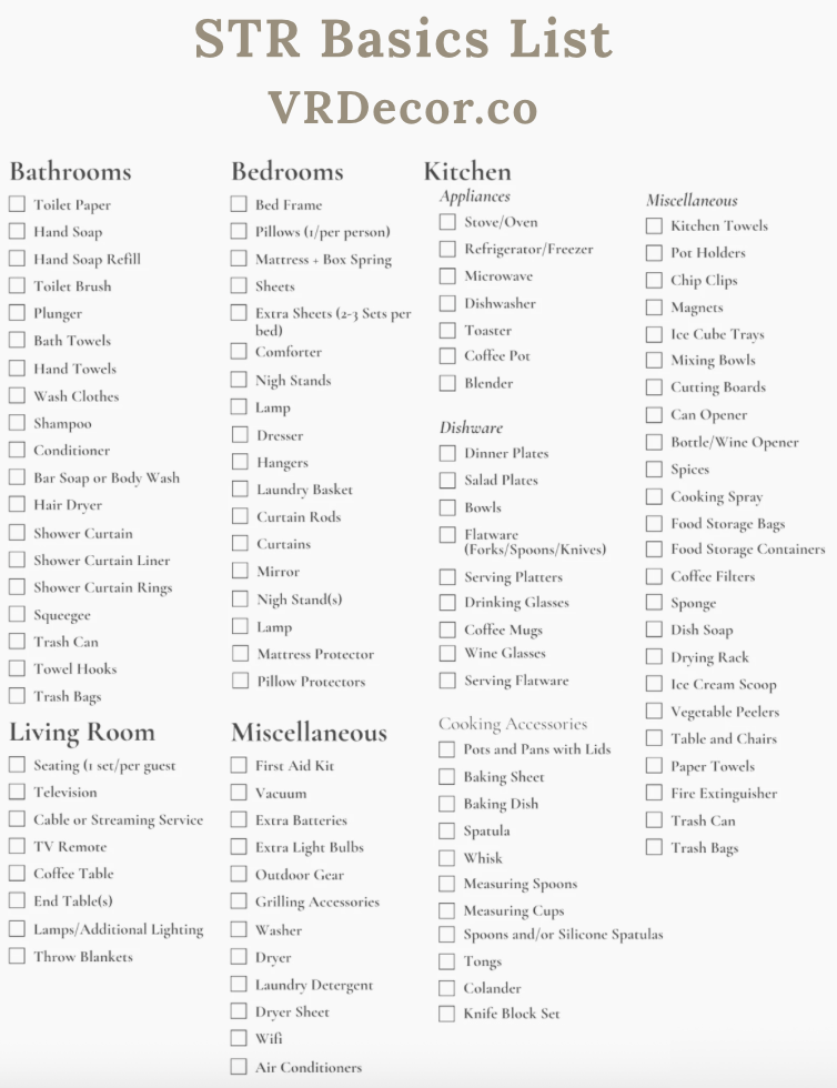 Decorating Resources - Enjoy! Contact Us with Any Questions, & Check Back for More Freebies (we add them all the time!) DECORATING TIPS Click for the Top 3 Strategies to Decorate for More $ ~ The FUNDAMENTALS! Download the Guide for Free Seasonal Decorating ~ Great for 5* REVIEWS Click for the Guide on and Insta-worthy STR ~ Excellent for REPEAT GUESTS Click for the Guide on Themes ~ Great to Get REPEAT GUESTS Click for the Items Shown to Earn You $50+ More per Night Click for Decorating for more Peace and Happiness at Home ~ FUNDAMENTAL for ALL Spacess ABOUT WORKING WITH AN STR DESIGNER Click for the Guide on Choosing an Interior Designer Download the Visual of What to Expect When We Work Together Click to Compare 24 AirBnb Designers of 2025 Click for What to Put into Your AirBnb Click to CALL / TEXT with Any Questions ~ We'd love to hear about your needs! PROPERTY IMPROVEMENT Click for info on the Real Cost of Furnishing Your STR Click for the Guide for Kitchen Reno Choices ~ TIMELESS and BUDGET-FRIENDLY Download the Guide to the 5 BEST PAINT COLORS ~ These really do work EVERY TIME! OTHER RESOURCES Click for the Poster of Hot Tub Rules Aaaaand a paid resource for Vacation Rental Owners—learn the EXACT process I use to decorate STRs for max revenue! Click here to LEARN More About the Course Click to ENROLL in The STR Decorating Formula Course