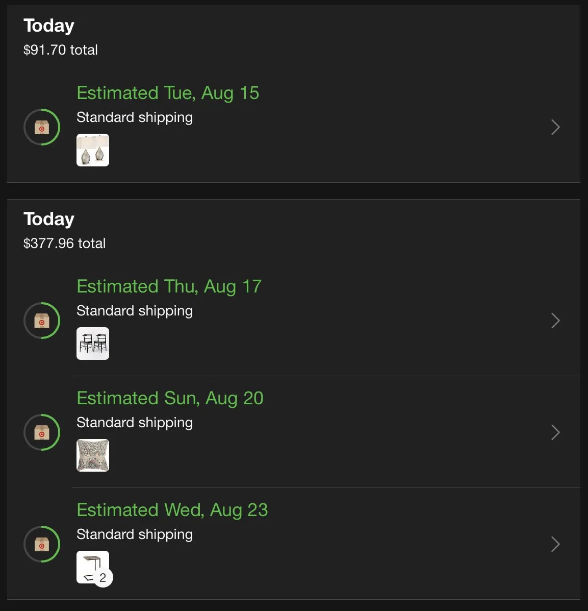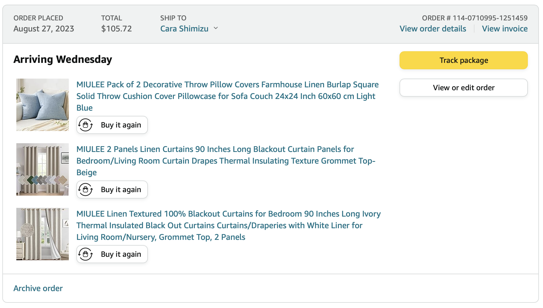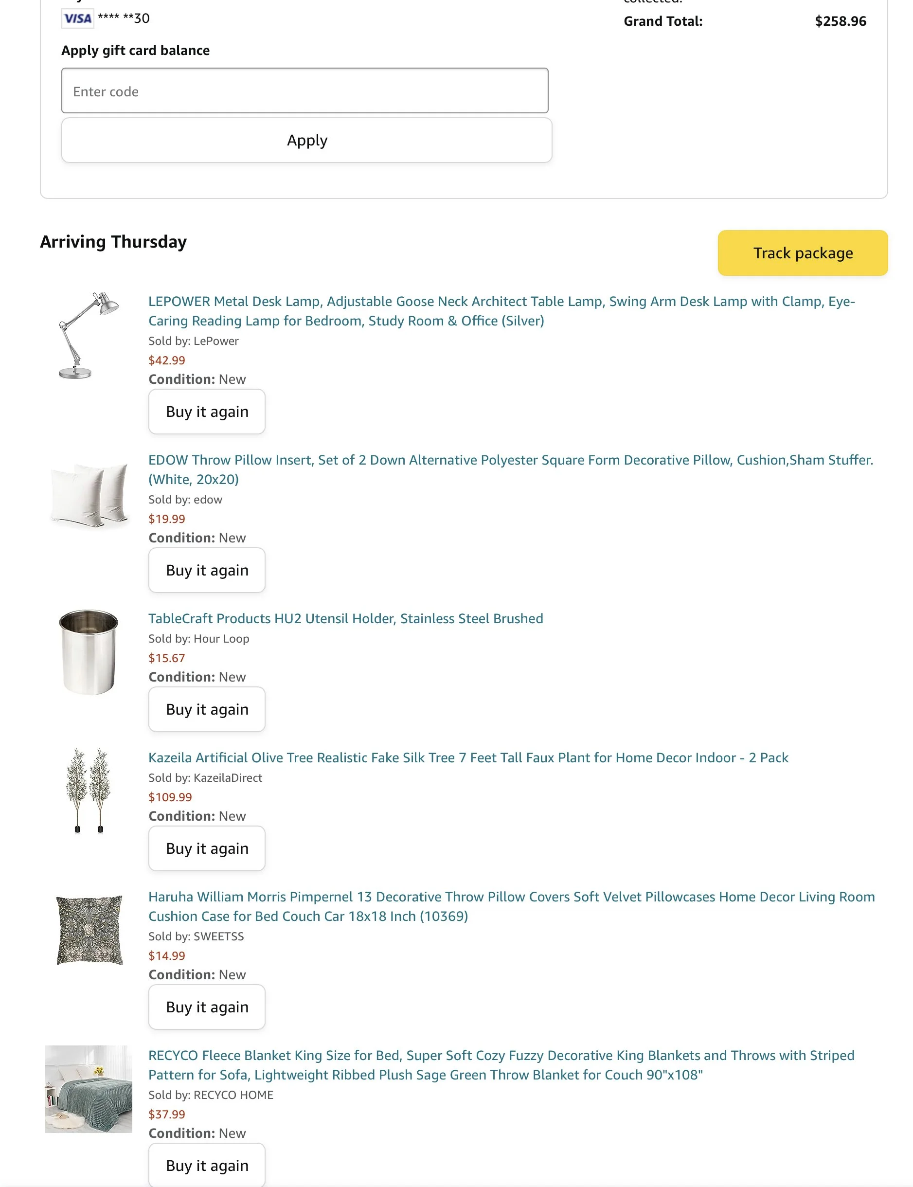 *Items purchased--see photos below = $3,007.18 (photos below, including side tables, lamps, pillows, decorative blankets, ceiling fans, rug, etc.)