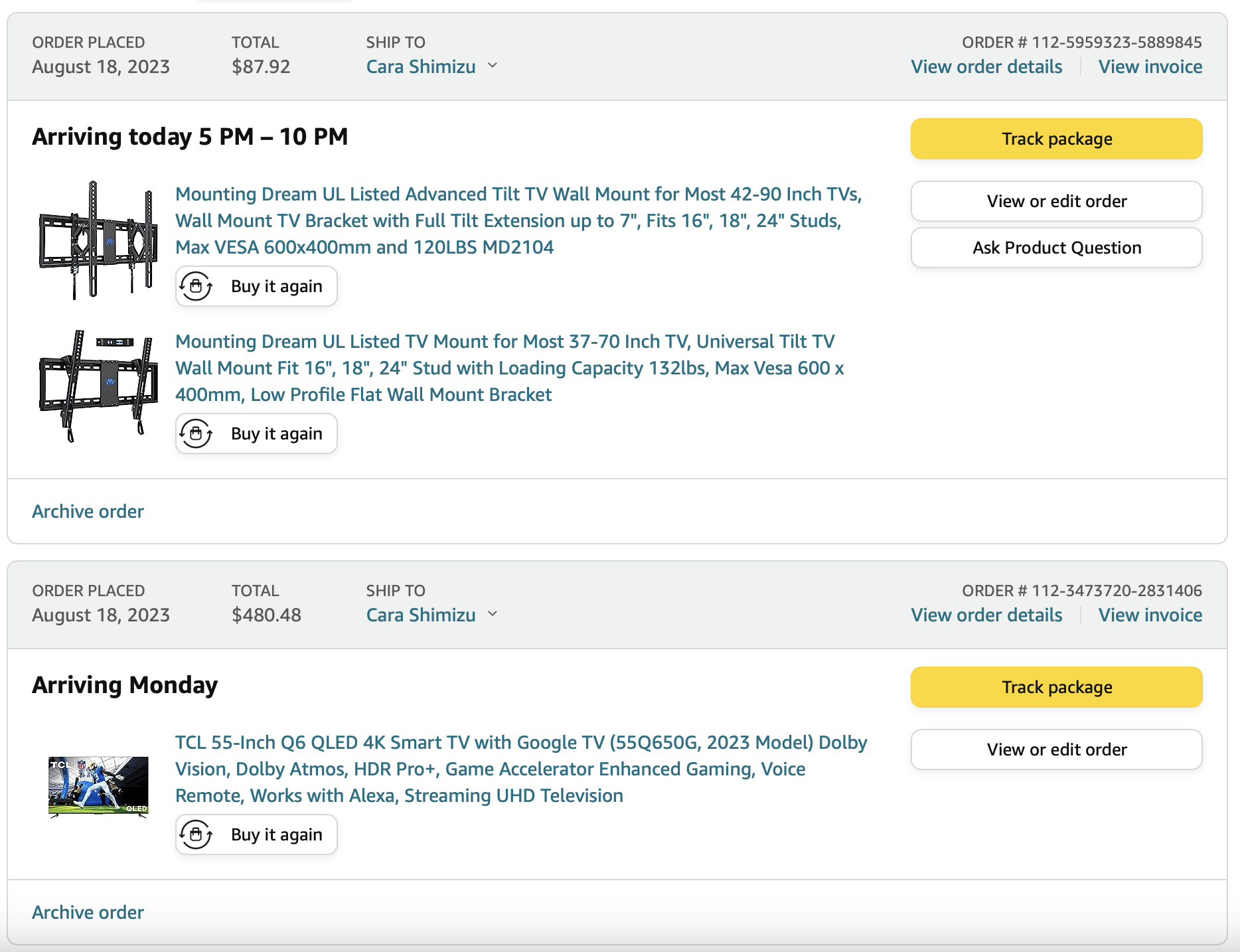 *Design fee Payment: 5.5h at $150/hr (Onboarding client, Removing unneeded items, On-site consulting, design development, item procurement, quality assurance of every item, item storage, resolution of item issues [damaged, not delivered, etc]) = $825 (8 hours pre-paid)