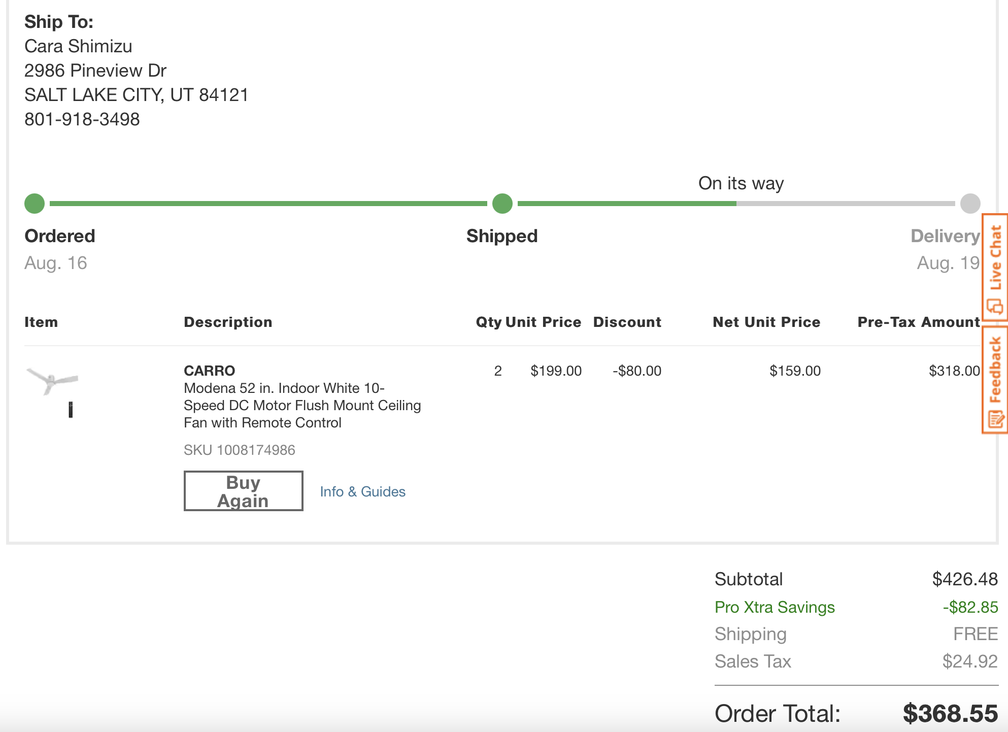 *Design fee Payment: 2.5h at $150/hr (On-site installation including ceiling fans & TVs, resolution of item issues [damaged, not delivered, etc]) = $375