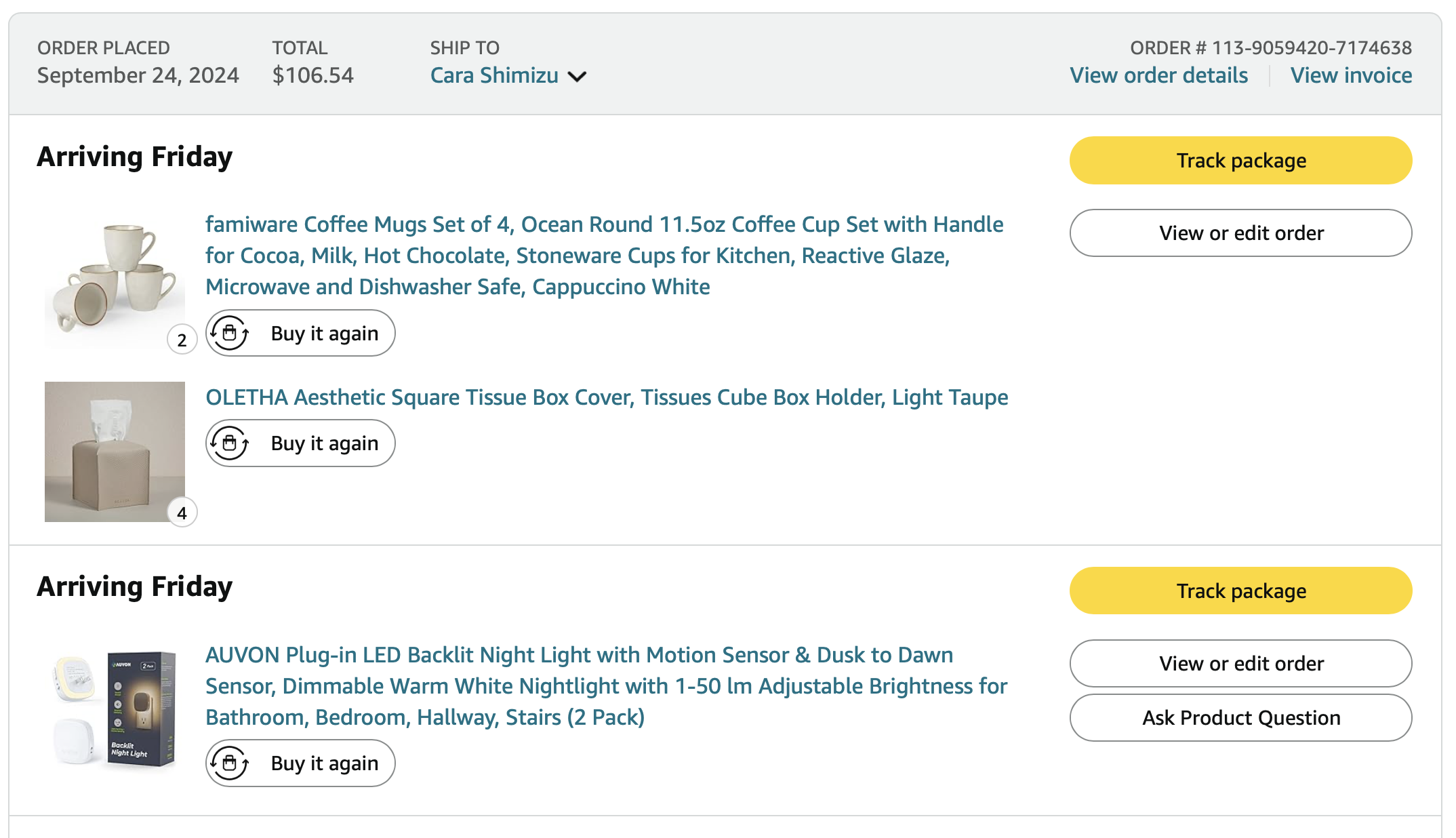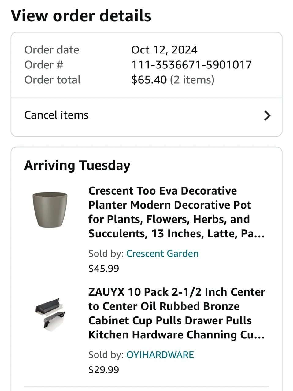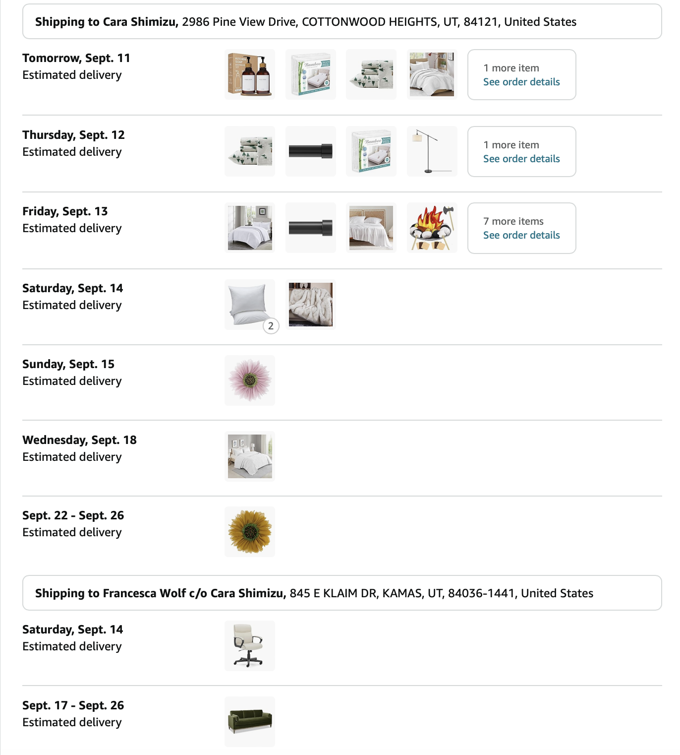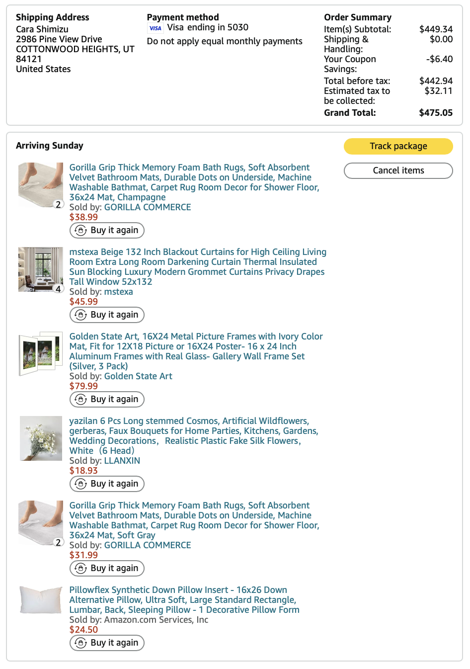Items purchased are listed with photos of receipts/orders placed