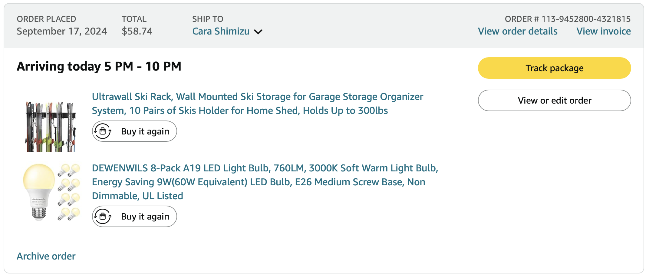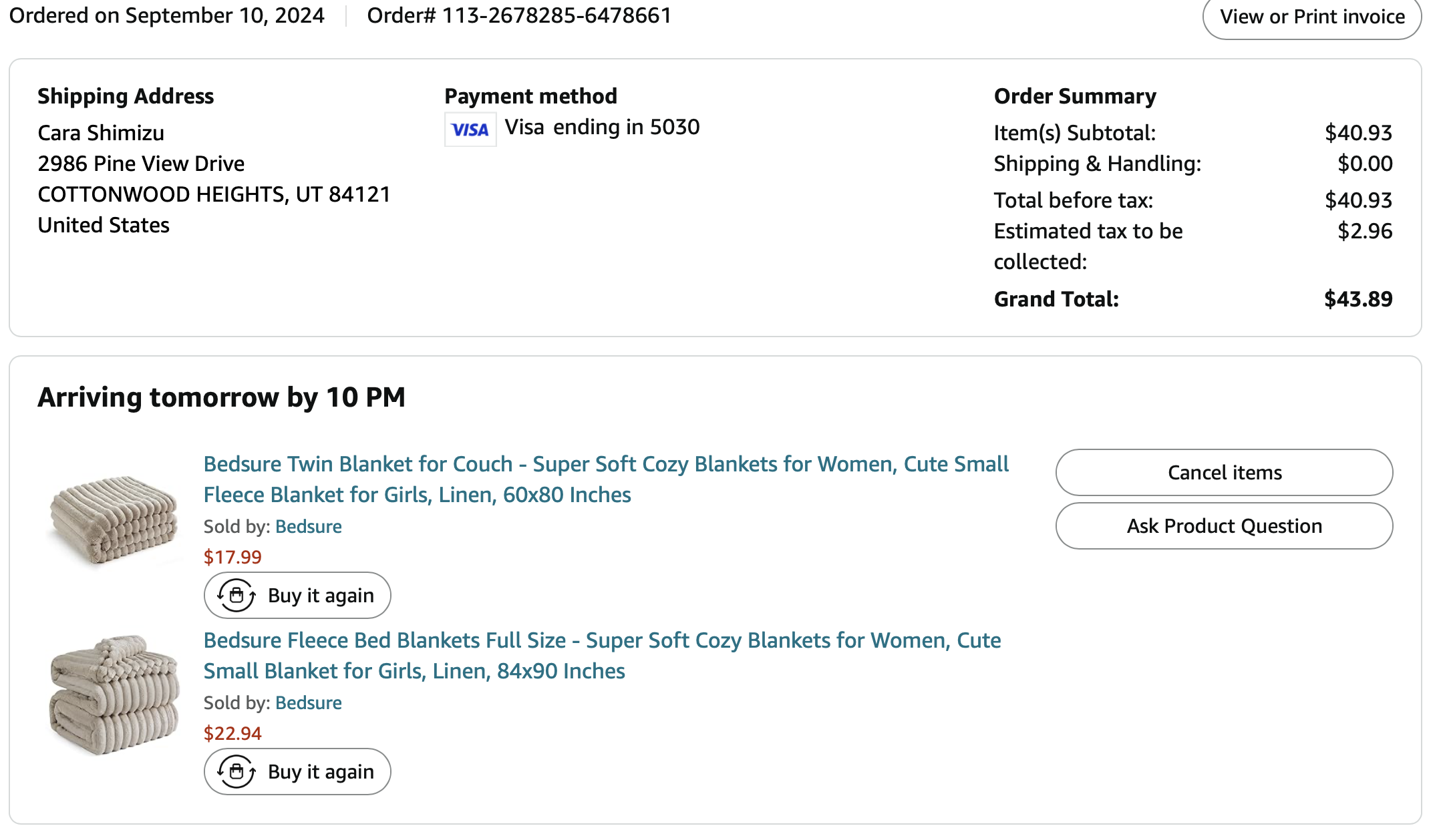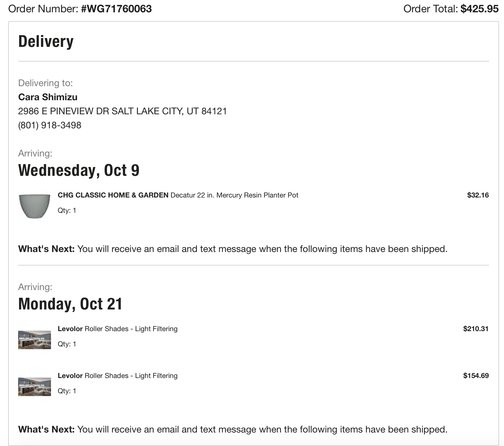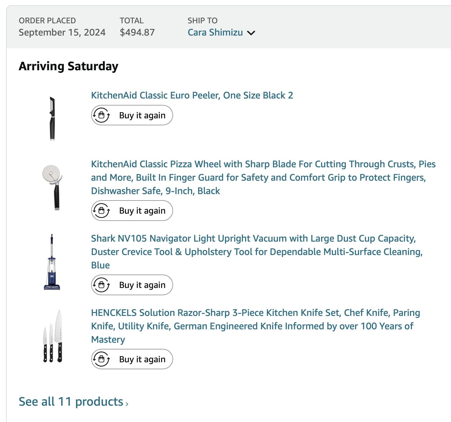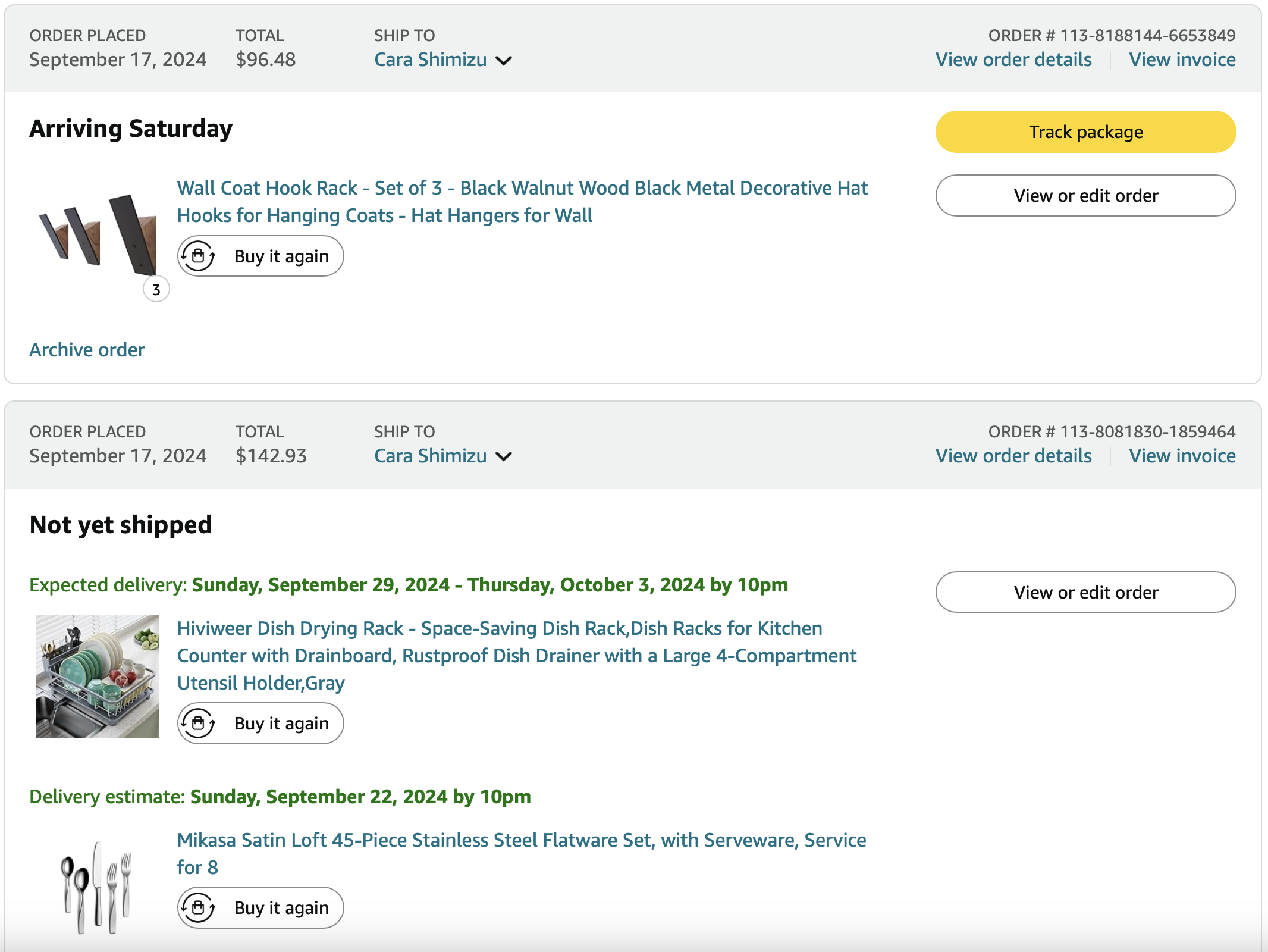 Items purchased are listed with photos of receipts/orders placed