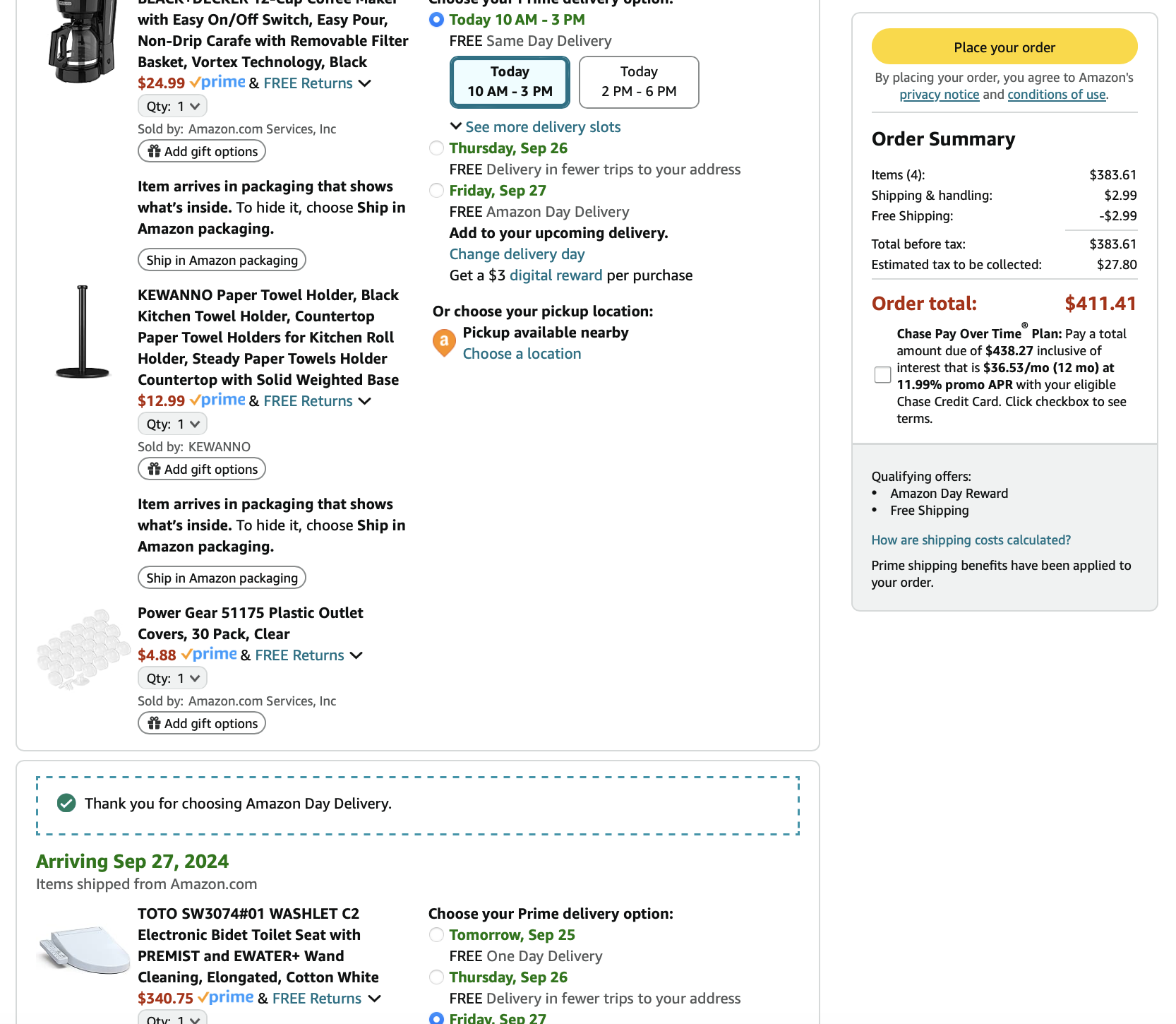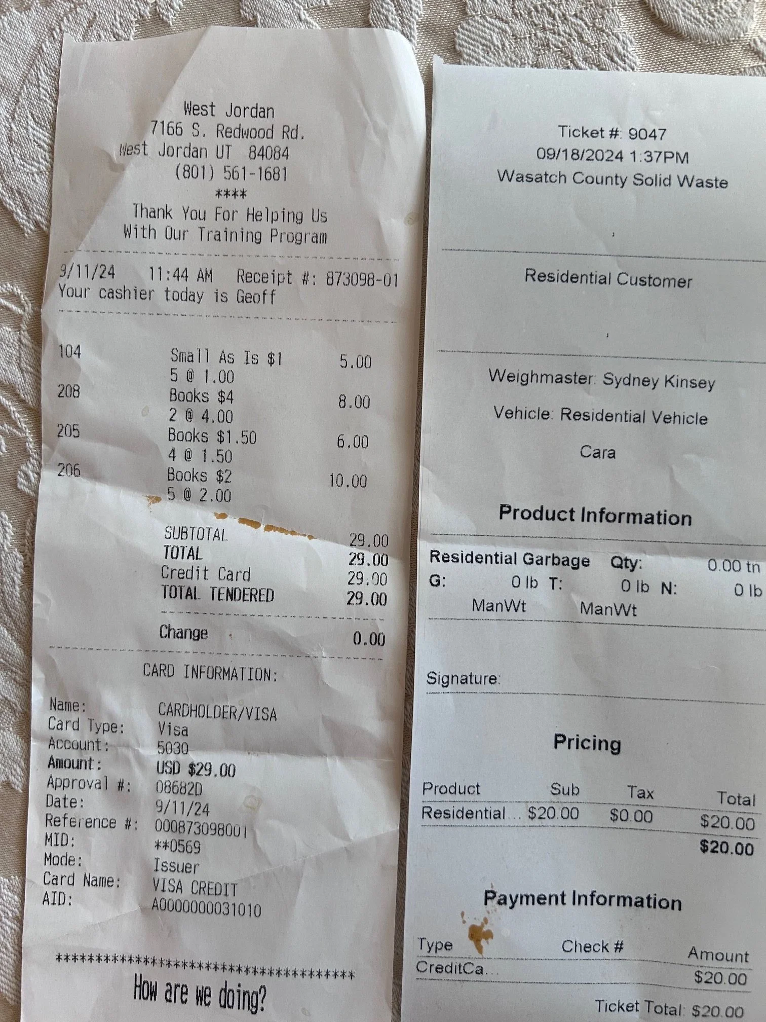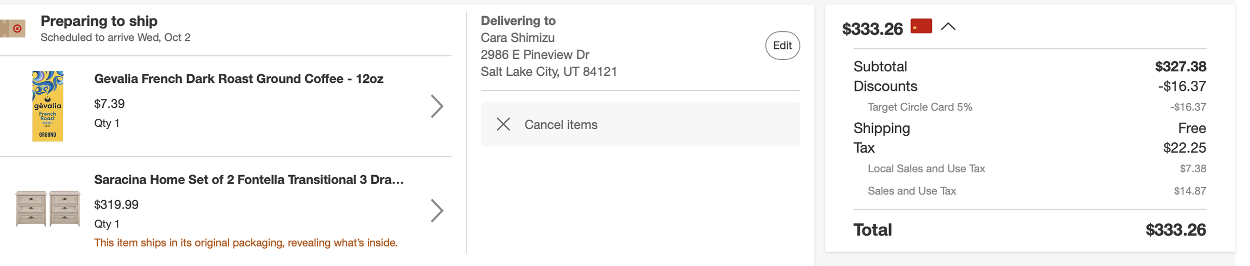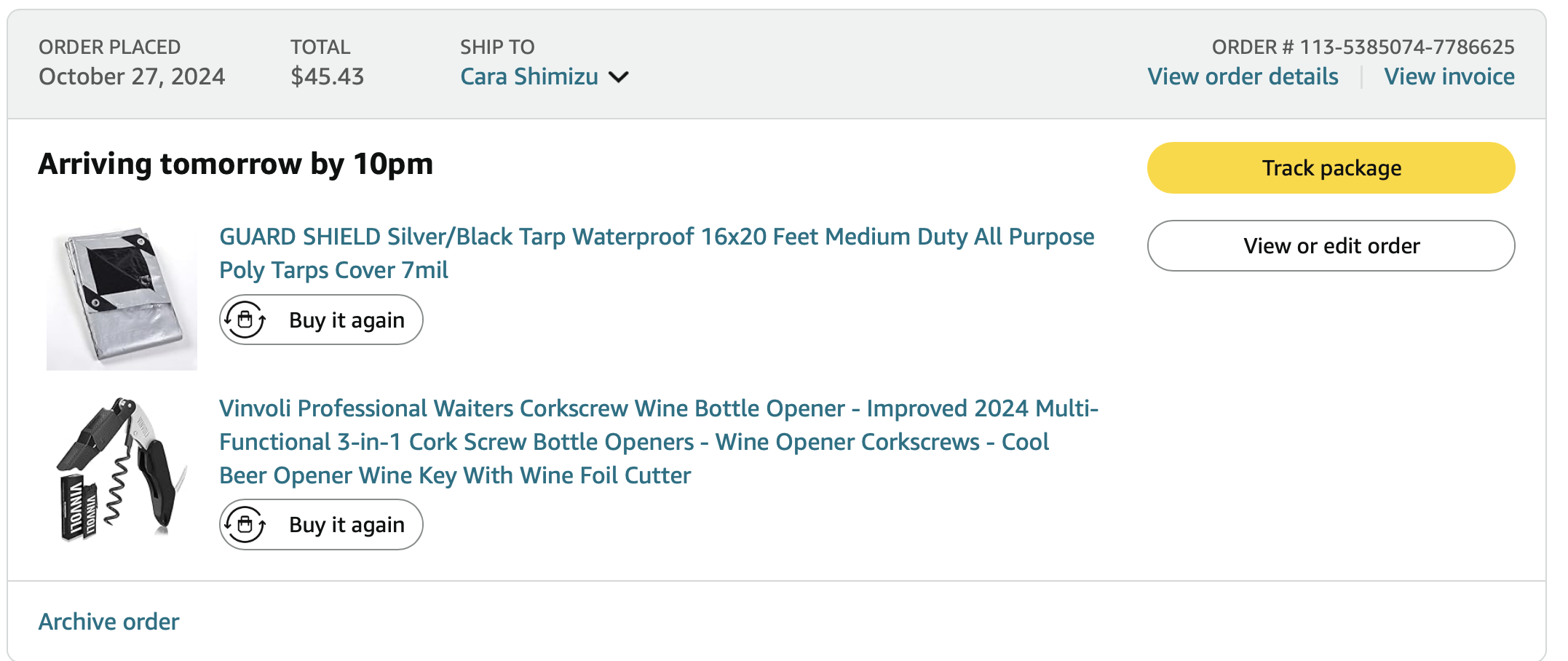 Items purchased are listed with photos of receipts/orders placed