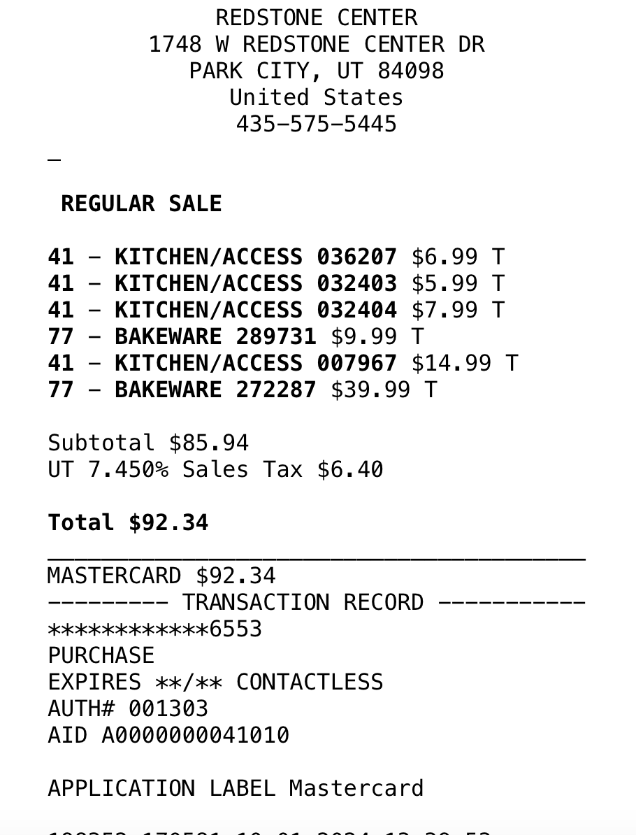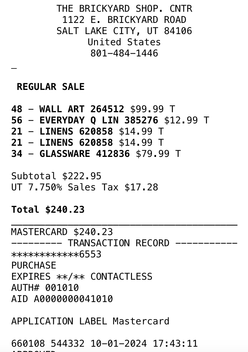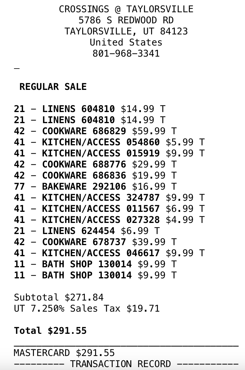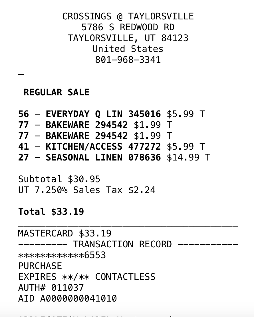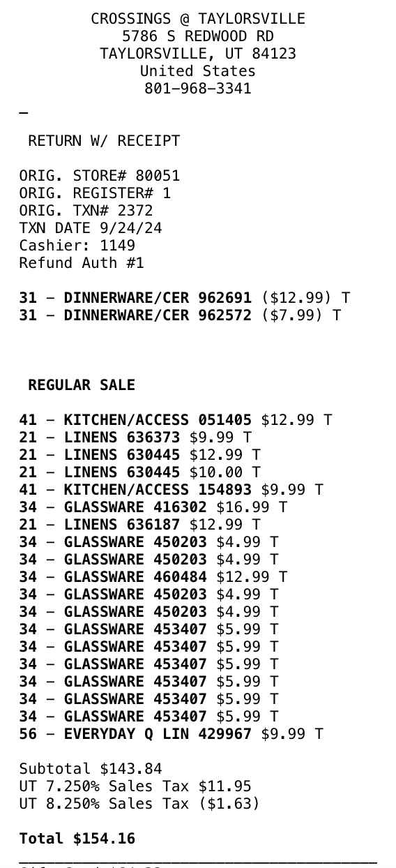 *Purchases WITH DESIGNER’S FUNDS (screenshots below)—including sheets, tea kettle, security bar for patio sliding door, place settings, wine goblets, roller shades for patio doors, and bath mats = $606.94 - (minus returns) $110.61 = $496.33