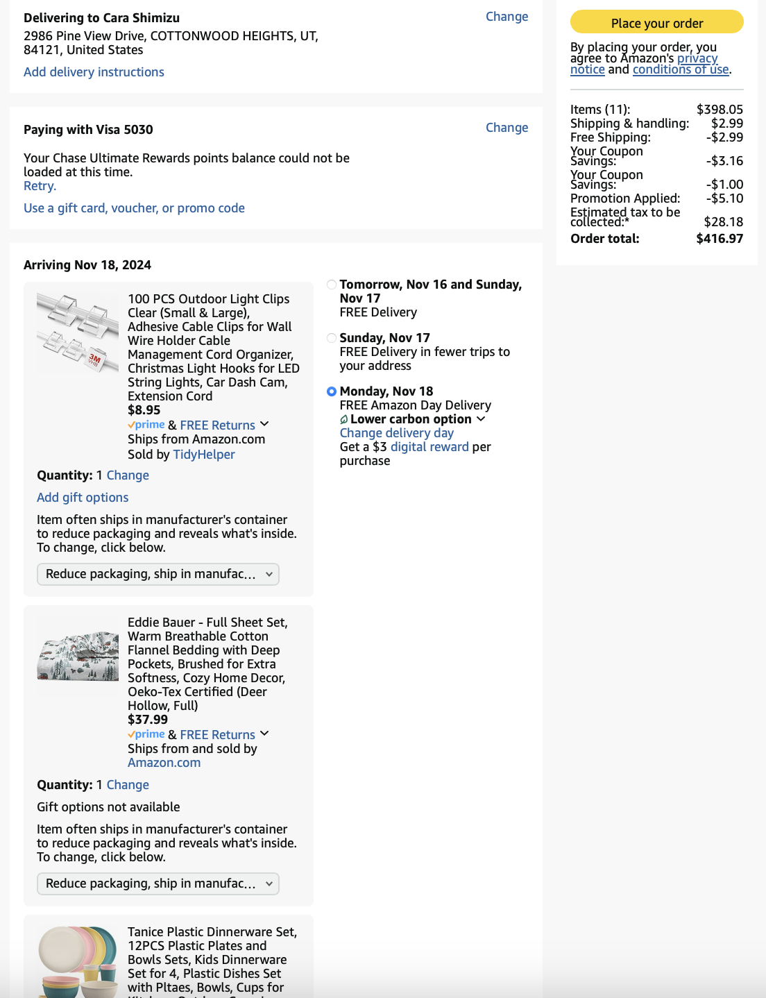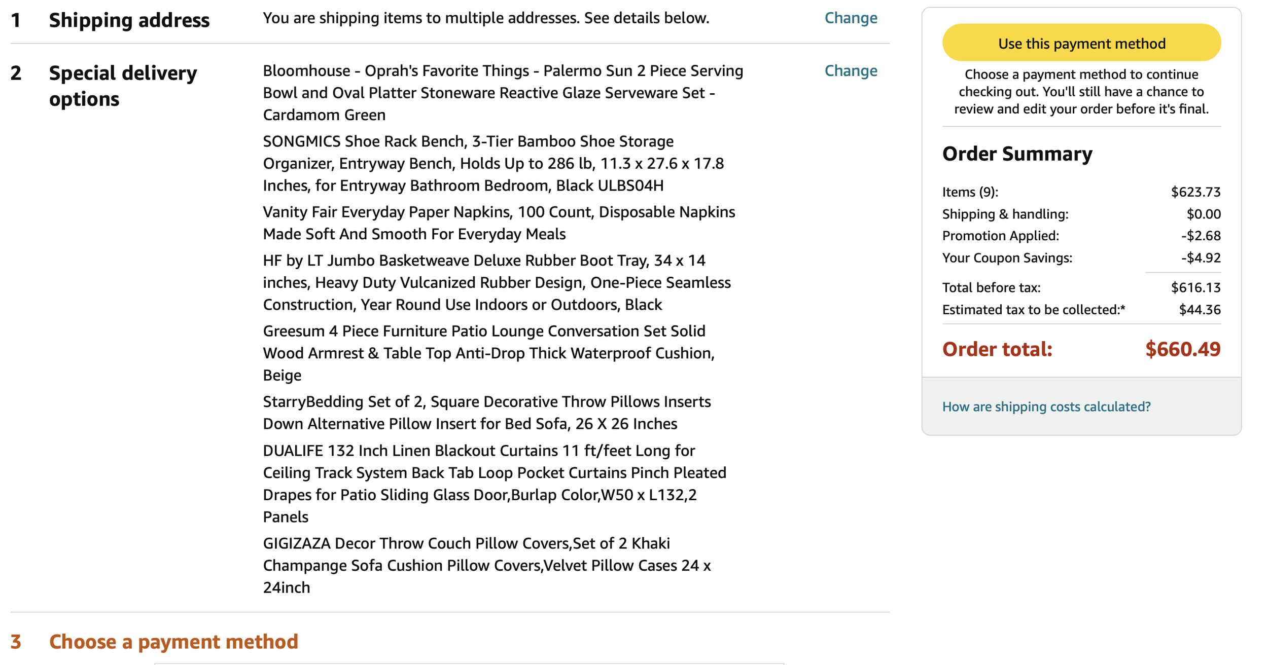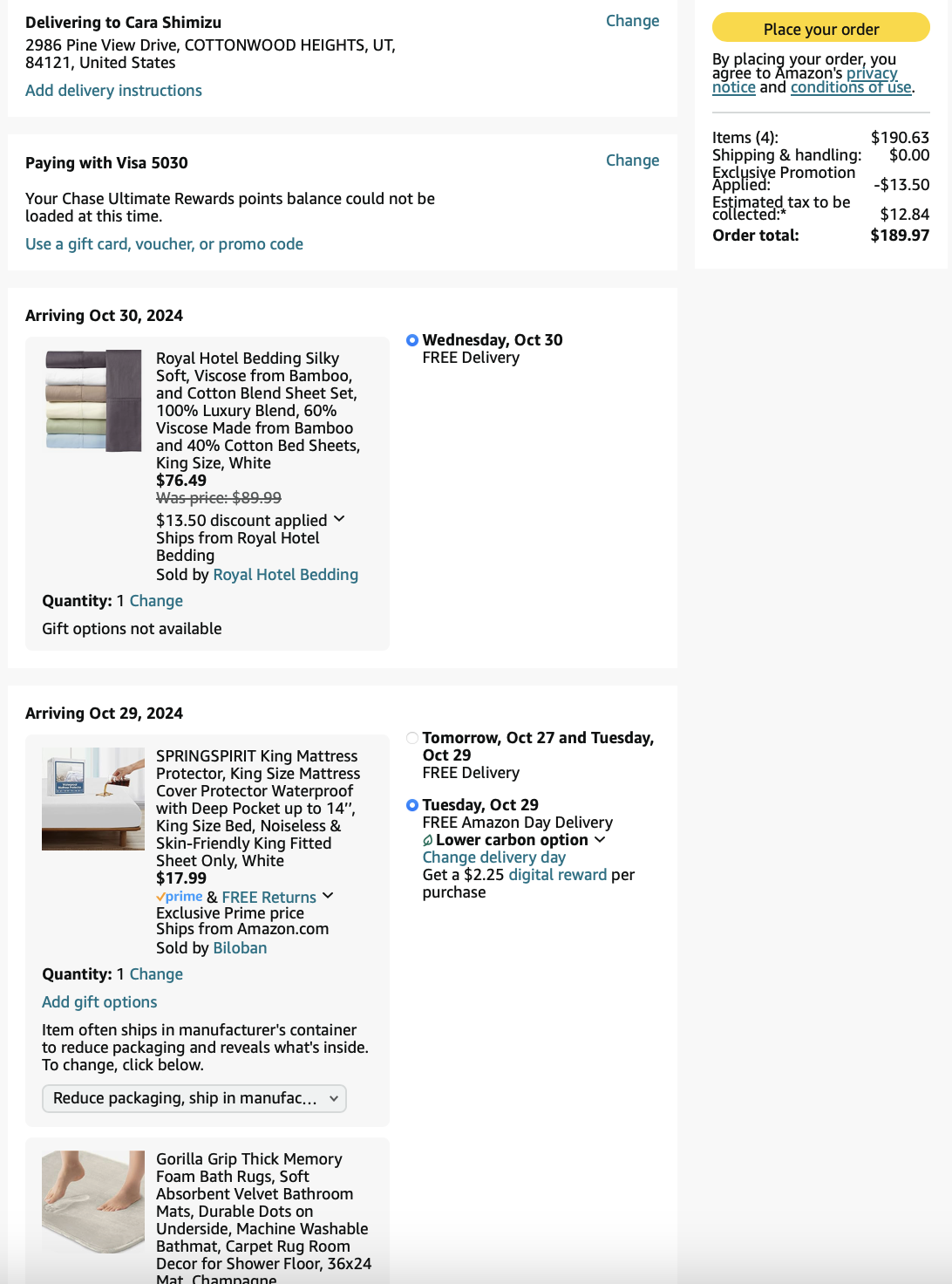 *Purchases WITH DESIGNER’S FUNDS (screenshots below)—including sheets, tea kettle, security bar for patio sliding door, place settings, wine goblets, roller shades for patio doors, and bath mats = $606.94 - (minus returns) $110.61 = $496.33