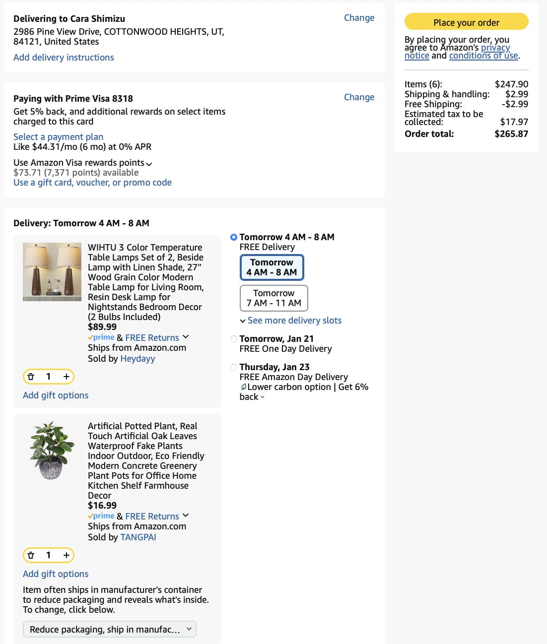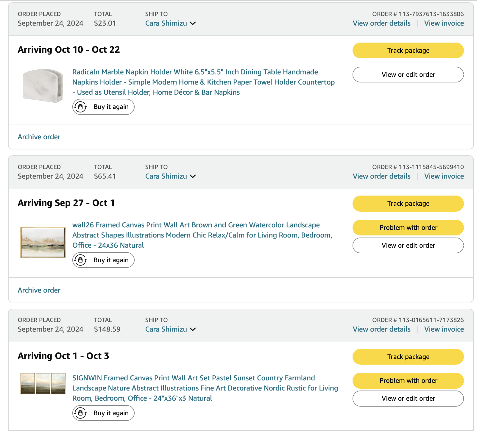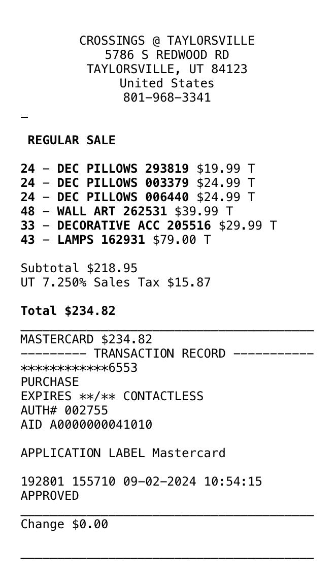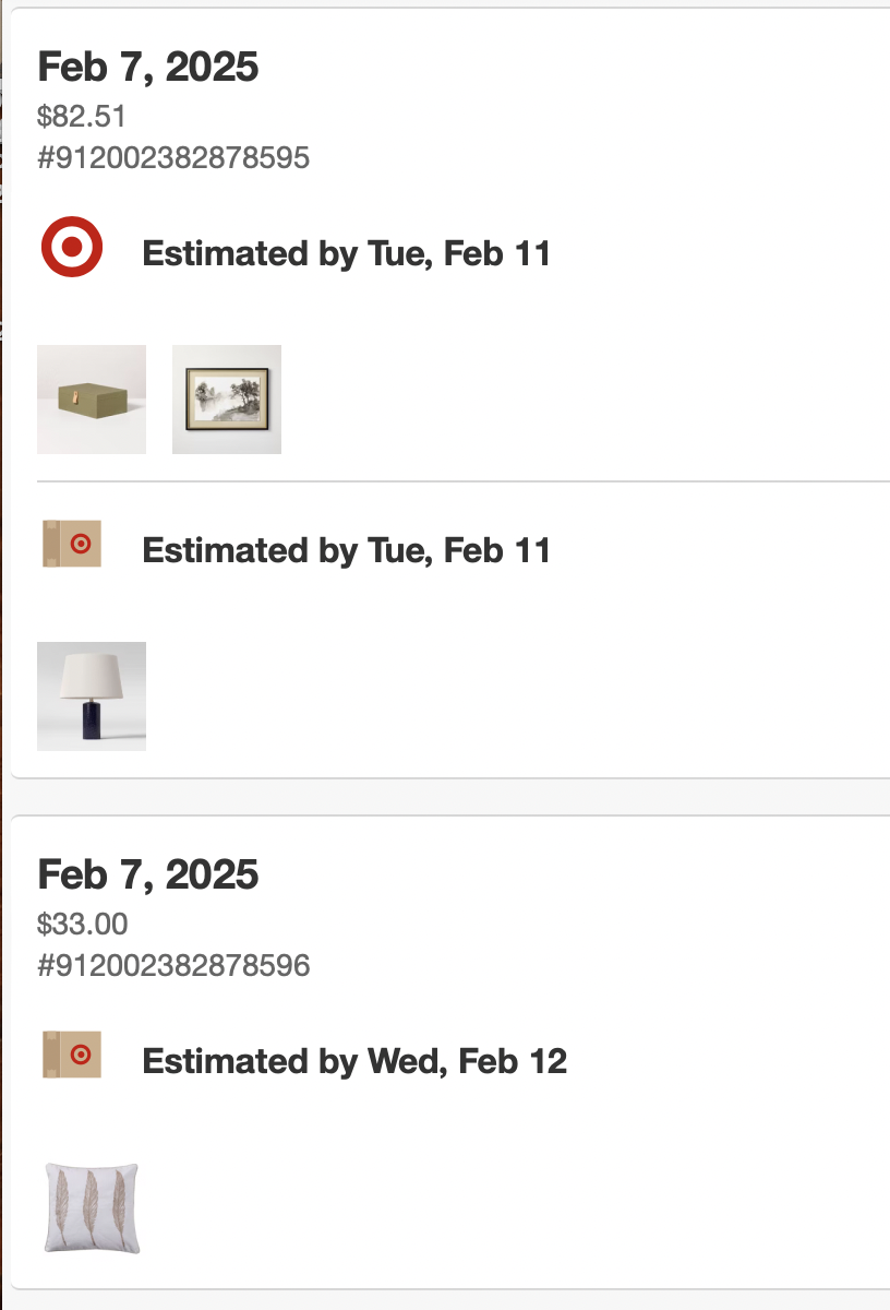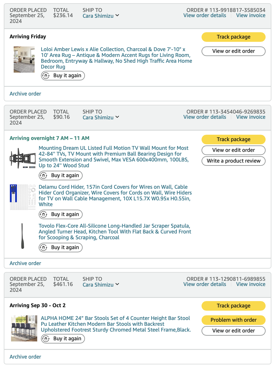 *Purchases (screenshots below)—lamps, art, dining table, pillows = $1497.54