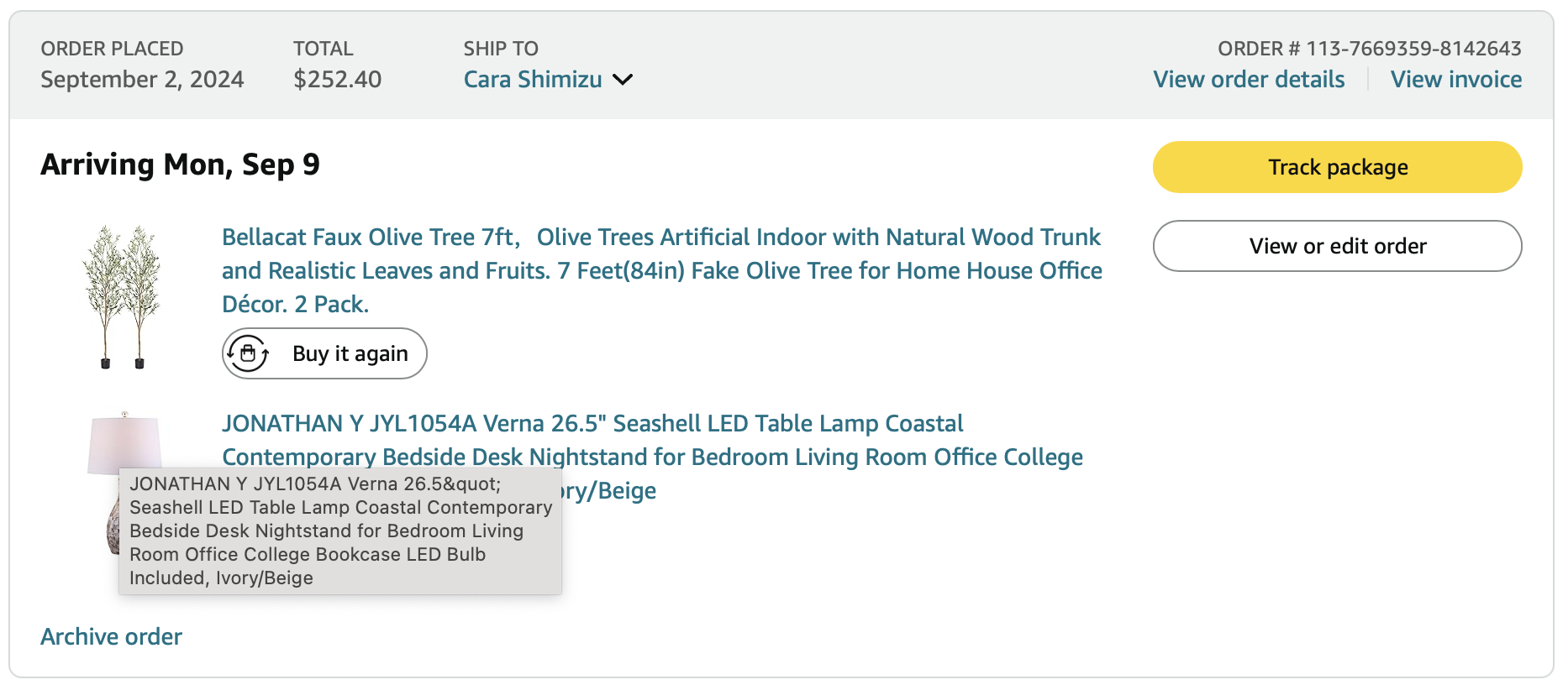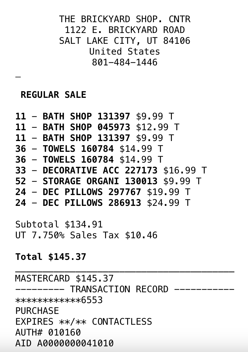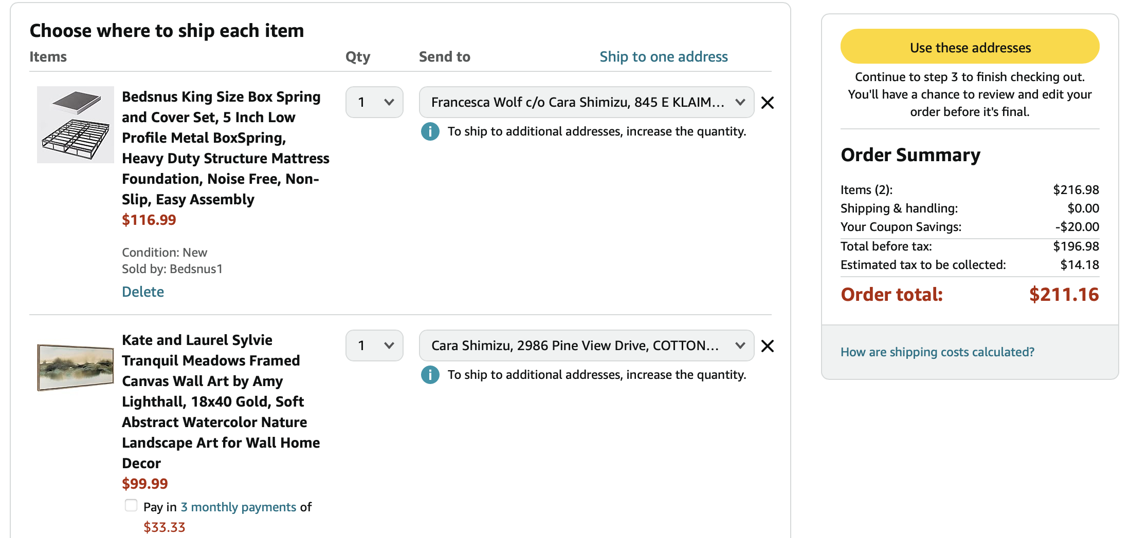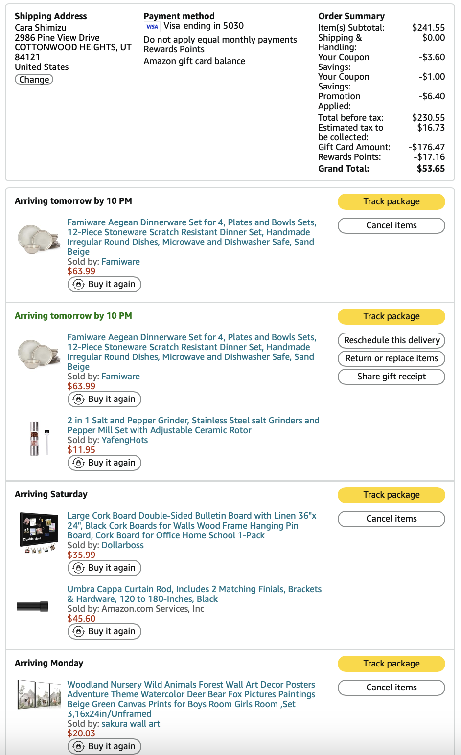 *Purchases (screenshots below)—lamps, art, dining table, pillows = $1497.54
