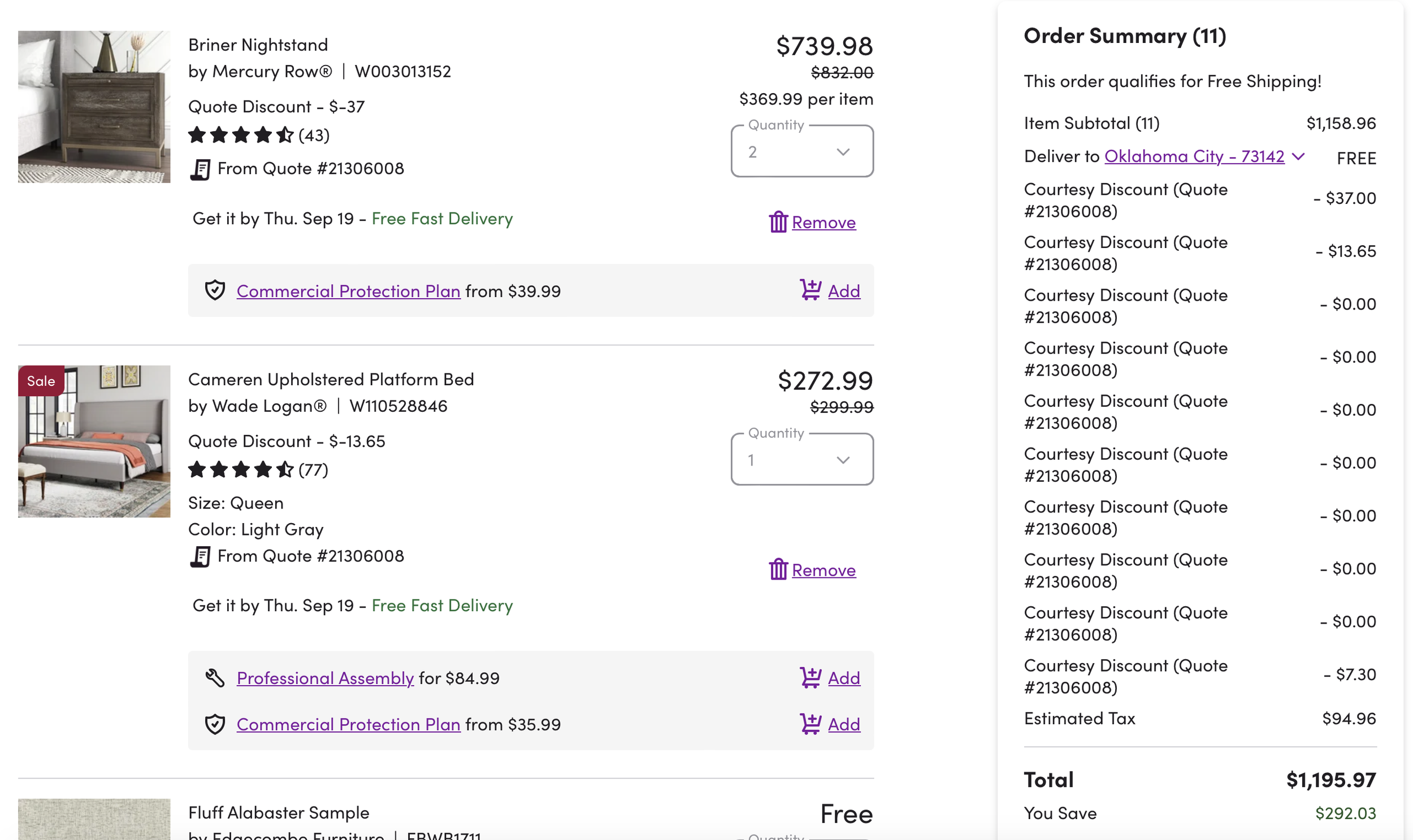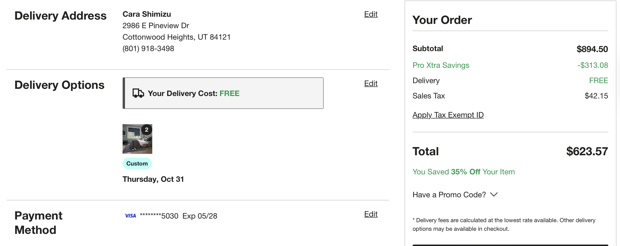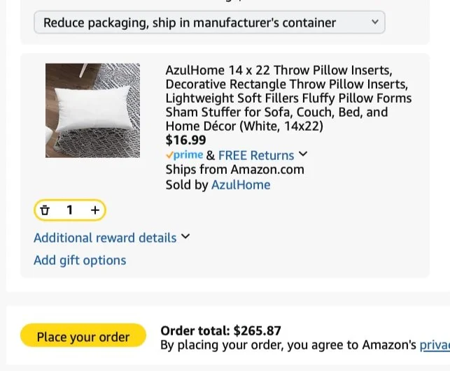 *Purchases WITH DESIGNER’S FUNDS (screenshots below)—including lamps, kitchen and bath supplies, pillows, rugs, living room coffee table, nightstands, bed, curtains, art = $3835.53