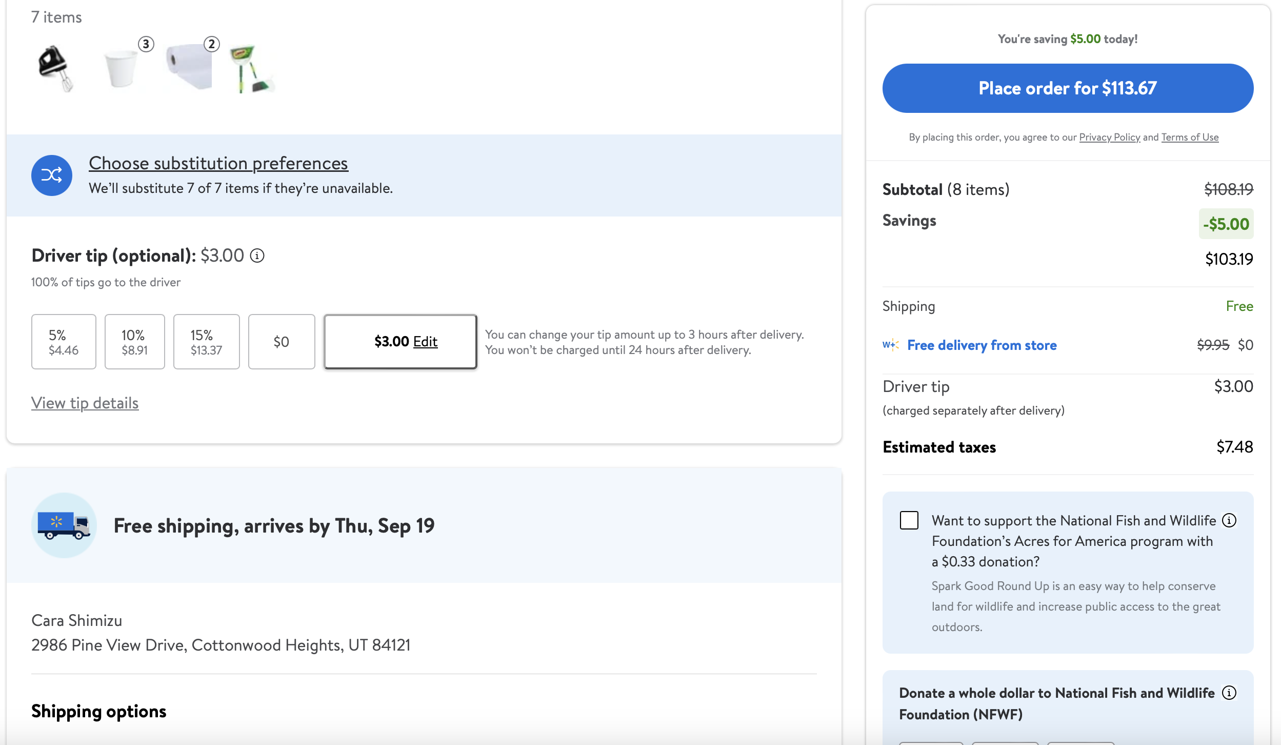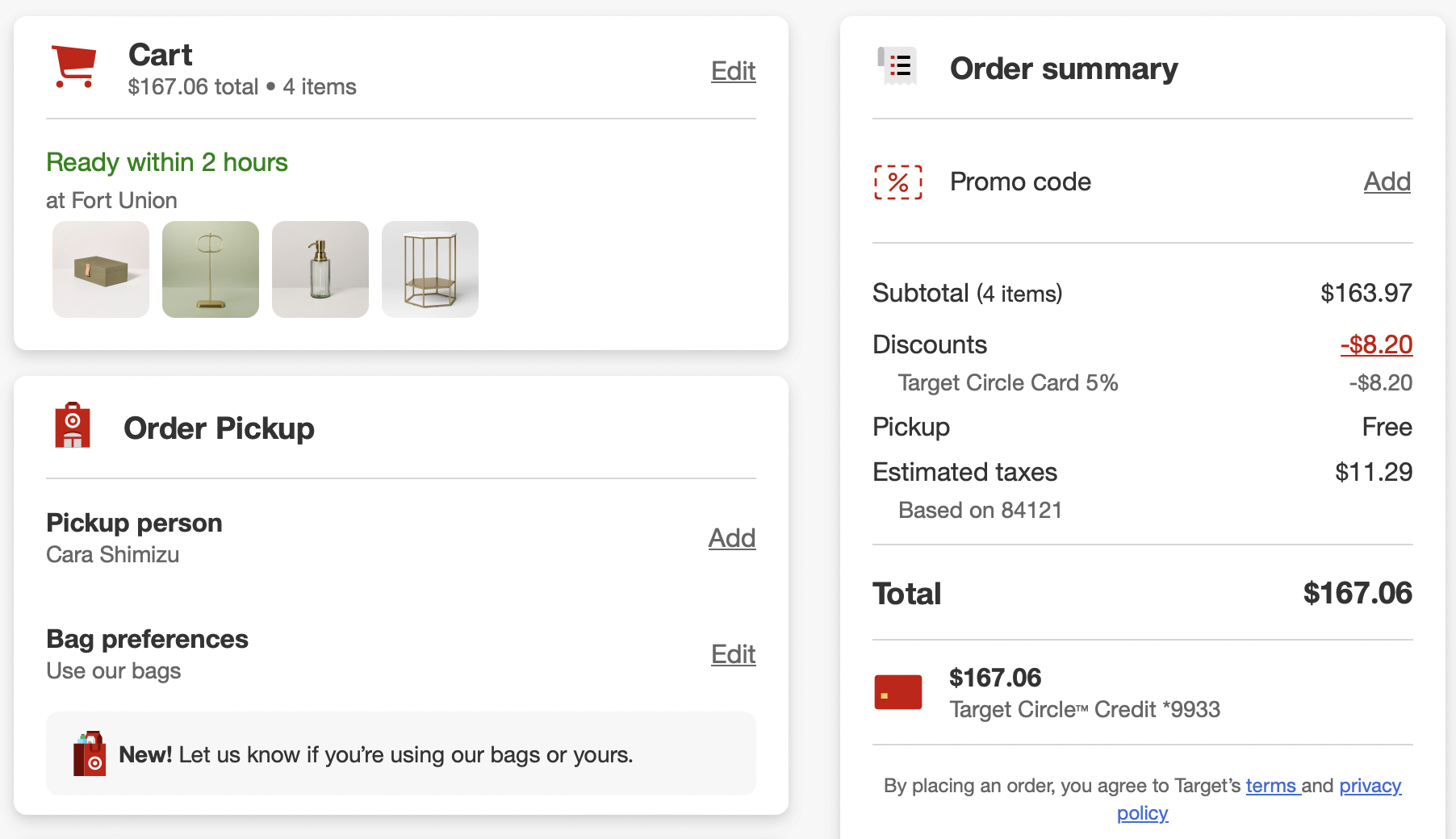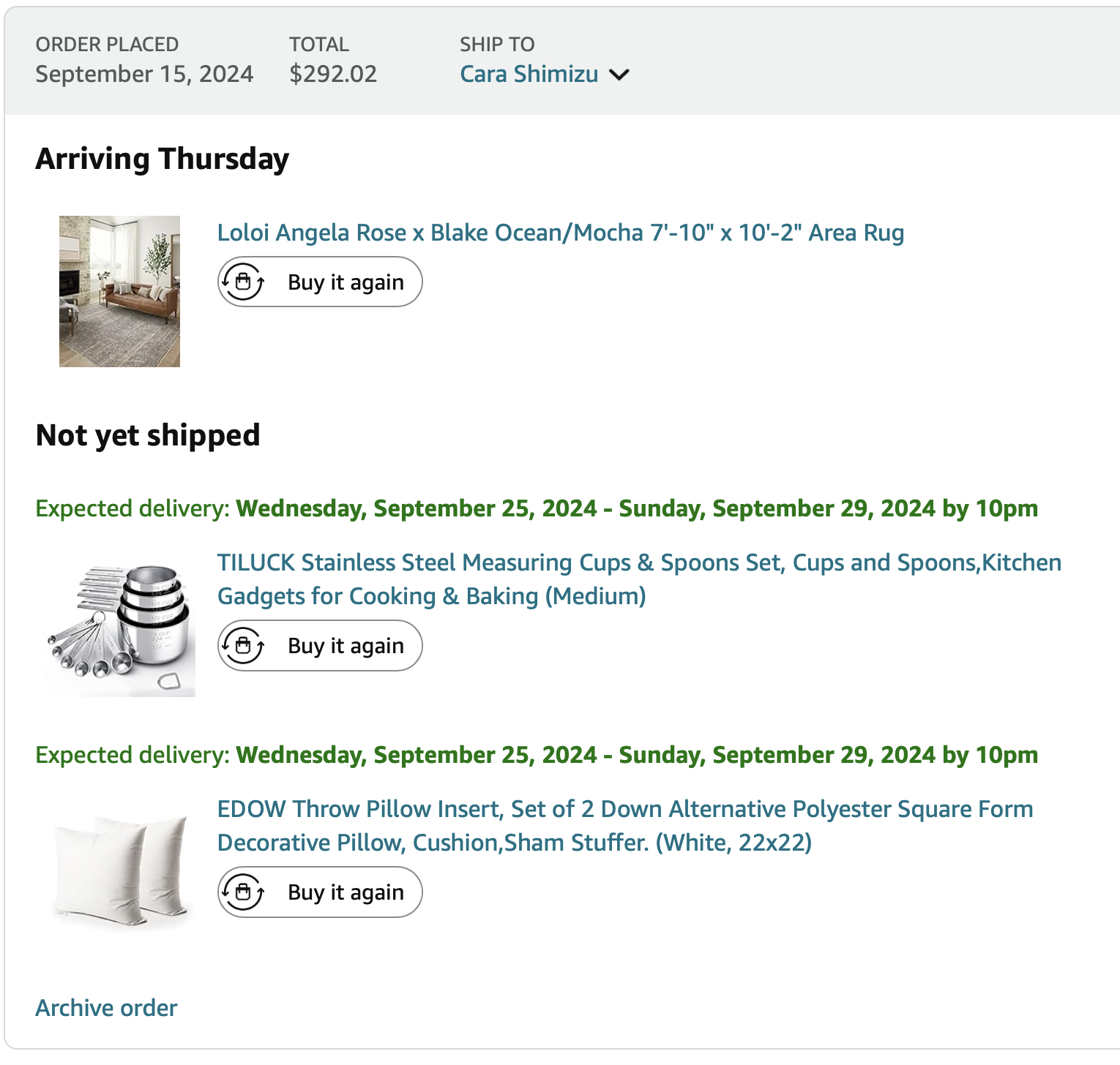 *Purchases WITH DESIGNER’S FUNDS (screenshots below)—including lamps, kitchen and bath supplies, pillows, rugs, living room coffee table, nightstands, bed, curtains, art = $3835.53