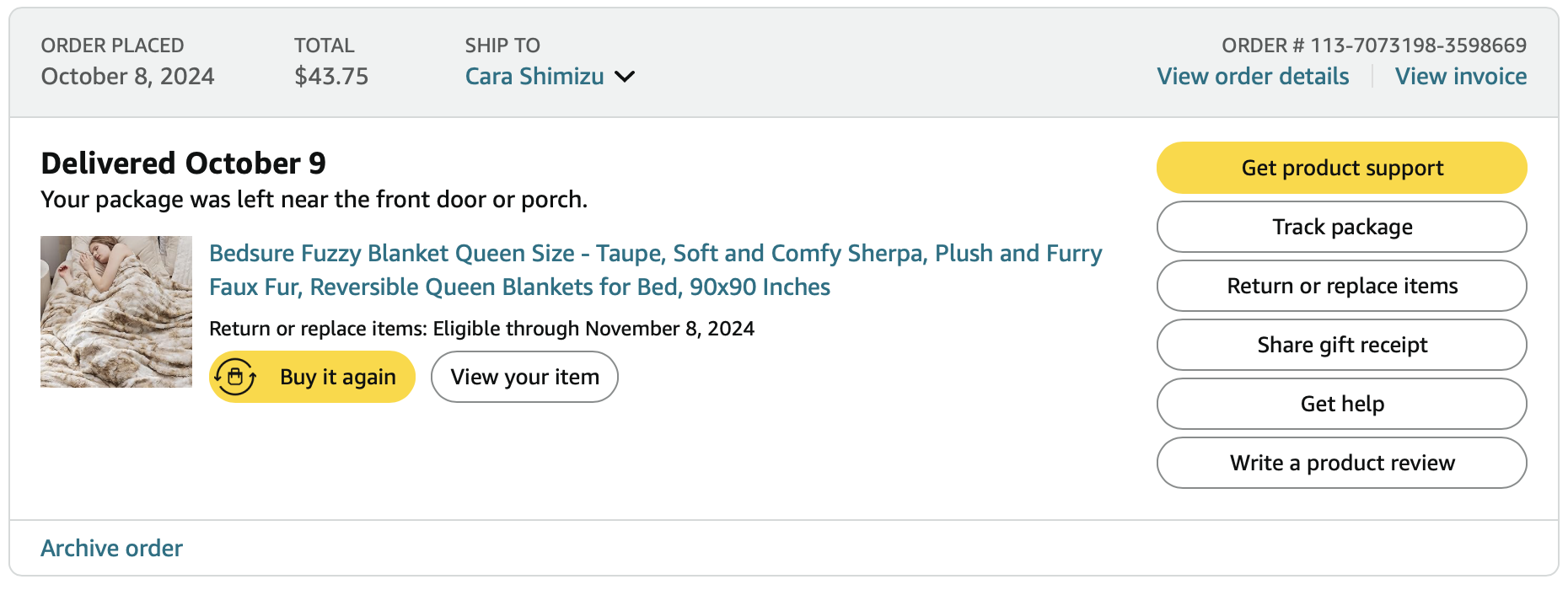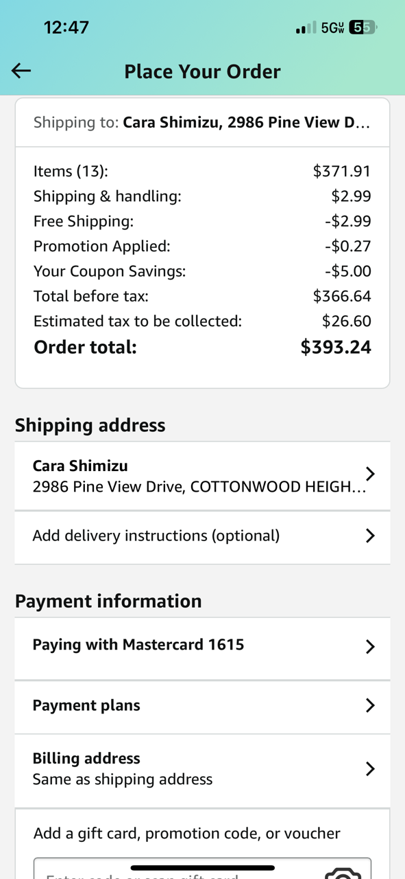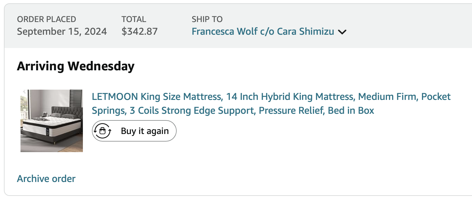 *Purchases WITH DESIGNER’S FUNDS (screenshots below)—including king bed & mattress, books, pillows, blankets, blinds for bathroom windows, curtains, packaging disposal, drawer organizers, coffee mugs, nightstands, entry mats, art, night lights, bar stools, fire pit, patio furniture, thrift store books, TV mount = $5489.94 - (minus returns) $466.12 = $5023.82