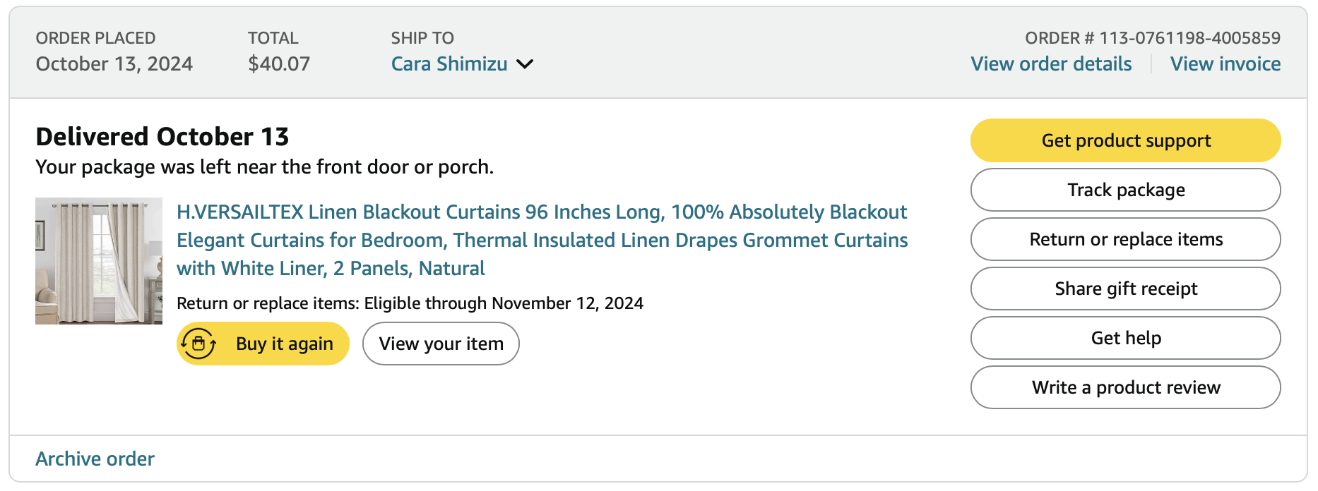 *Purchases WITH DESIGNER’S FUNDS (screenshots below)—including shades for patio door windows, curtains, accessories, art = $1825.53 - (minus returns) $258.10 = $653.94